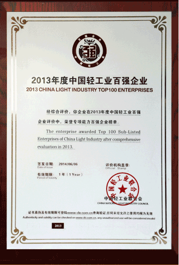 2013年度榮獲中國輕工企業(yè)百強(qiáng)企業(yè)
